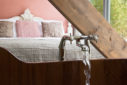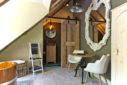 Prominent aanwezig in het midden van de kamer is een handgemaakt ligbad van hout.